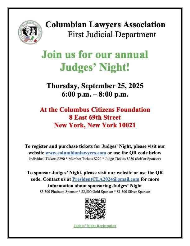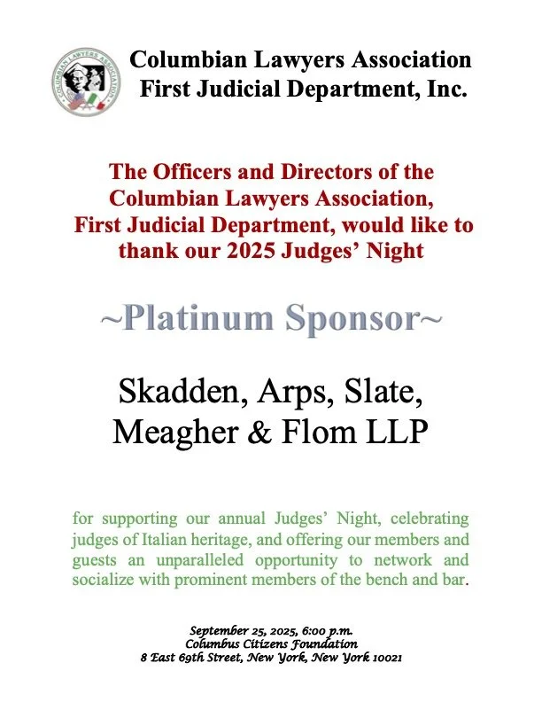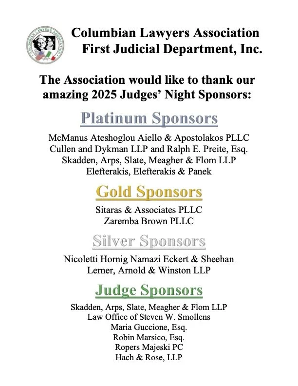 Many thanks to McManus, Ateshoglou, Aiello & Apostolakos, Cullen and Dyman, LLP, Skadden, Arps, Slate, Meagher & Flom, LLP, Elefterakis, Elefterakis, & Panek, and Ralph Preite for their Platinum Sponsorship of 2025's Judge's Night. Special Thanks to All our Sponsors Columbian Lawyers of the First Department Register Here for this Event! Upcoming Events:
